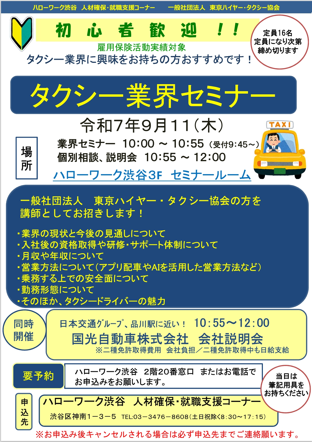 セミナー後は、個別面談・相談会も開催。日本交通グループの国光自動車が参加して、会社の魅力をお伝えします。国光自動車は品川駅に実走5分の好立地に、本社・営業所を構える老舗として、求職者に人気のタクシー会社です。セミナーの参加には、予約が必要です。お申し込みは、ハローワーク渋谷まで。